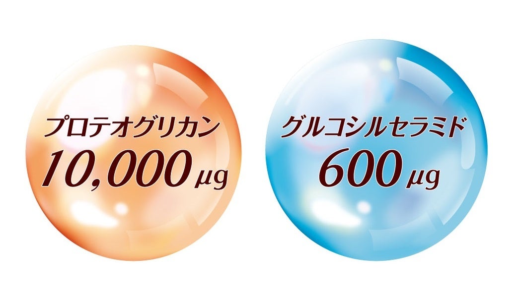 ○プロテオグリカン10,000㎍配合。こんにゃく由来グルコシルセラミド600㎍配合。