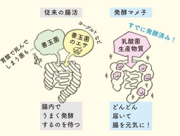 発酵マメ子シリーズ共通のキー成分といえば、胃酸などにも比較強く、腸にダイレクトに届いて働くと言われる 「乳酸菌生産物質」。 有機大豆と 21種の乳酸菌を特許技術で発酵させたもの※2 で、本来なら腸活がうまくいった結果、自然に生まれる安心・安全な成分です。