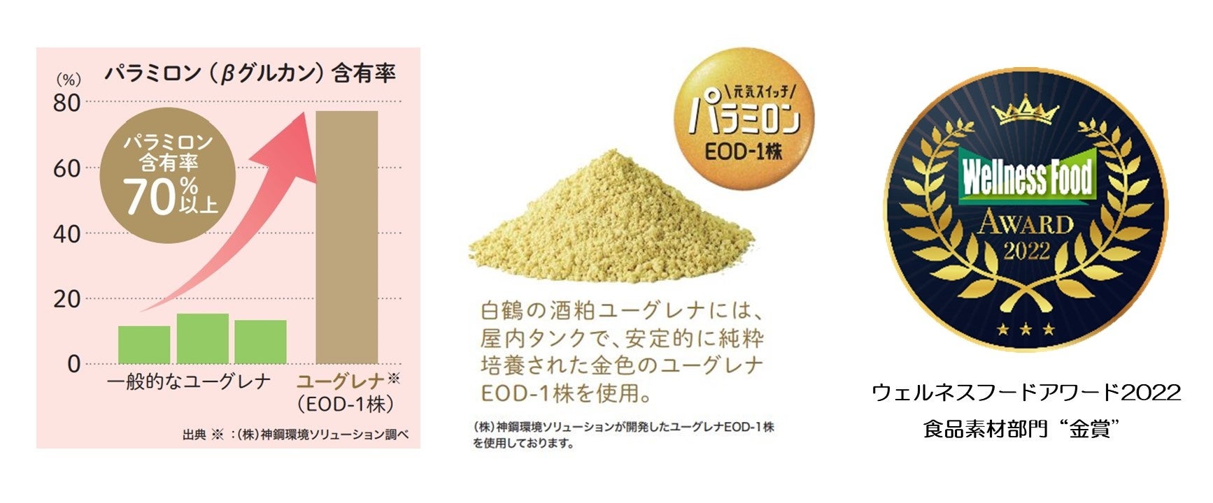 「白鶴 酒粕ユーグレナ」に使用している純粋培養された金色のユーグレナ(EOD-1株)は、ユーグレナ特有の注目成分「パラミロン」が70%以上含まれる特別なユーグレナです。「パラミロン」は、β-グルカンという食物繊維の一種で、従来の食物繊維とは異なる健康機能から多くの研究者が注目しています。