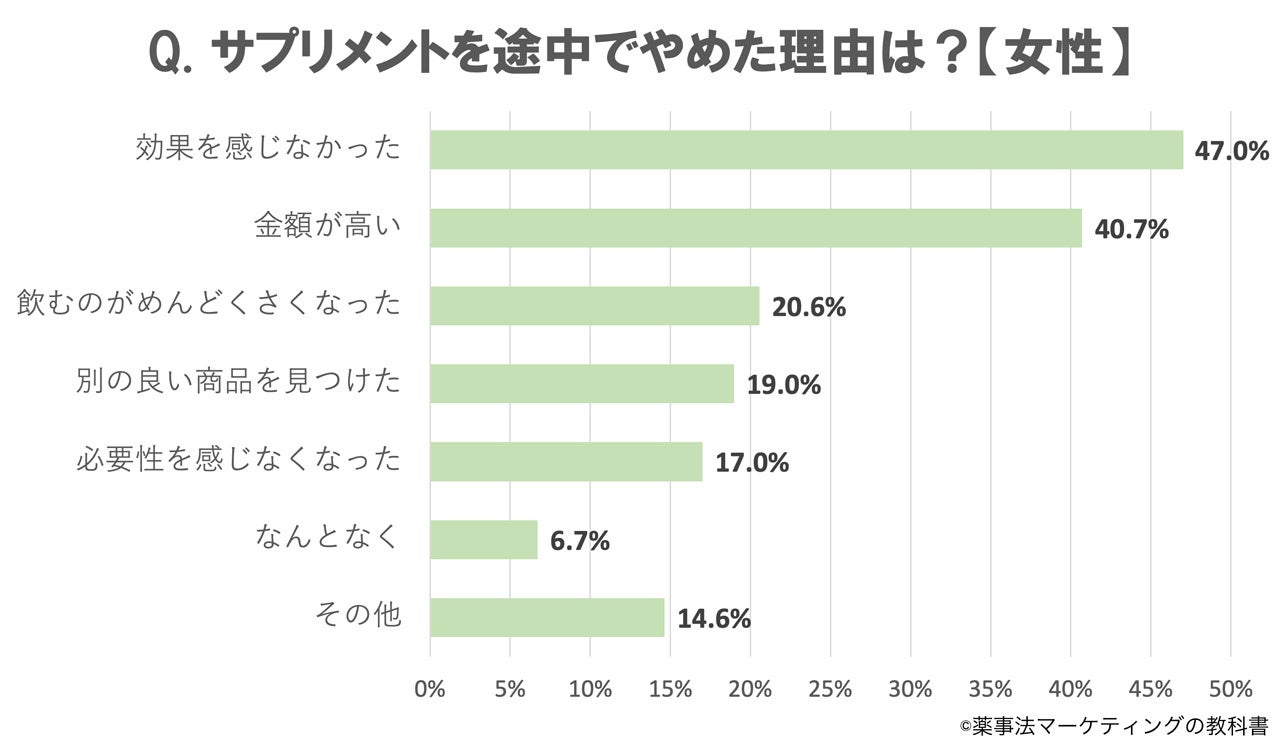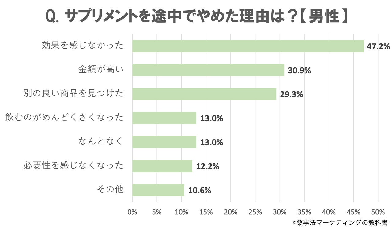 逆に女性は男性より「金額が高い」ことを理由にやめる人の割合や、「飲むのがめんどくさい」「必要性を感じなくなった」ことを理由にやめる人の割合が高いことがわかりました。