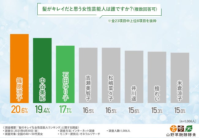そこで今回、ザクロ酵素「山野草醗酵酵素 若榴da檸檬(https://www.kotohogi.co.jp/shohin-joho/zakuro.html)」を販売する株式会社言歩木は、全国の40~50代男女を対象に、「髪のキレイな女性芸能人ランキング」に関する調査を実施しました。