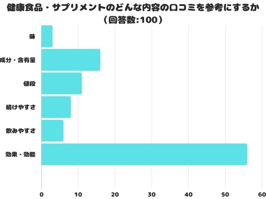 健康食品・サプリメントのどんな内容の口コミを参考にするかをアンケートにて調査したところ、1位は「効果・効能」でした。