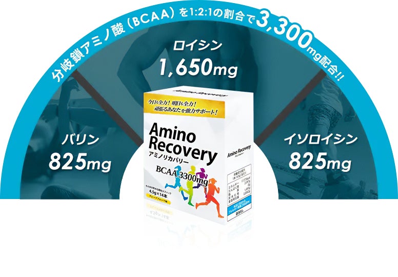 本商品はアスリートの悩みである疲労に着目し、運動時に特に重要となるBCAA(必須アミノ酸のうちバリン・ロイシン・イソロイシンの総称)を1:2:1の割合で3,300mg配合した、そのまま飲めるスティックタイプのサプリメントです。
