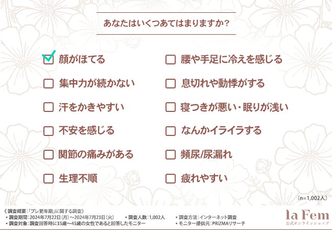そこで今回、ジャパンローヤルゼリー株式会社(https://www.jrj.co.jp/)は、35歳~45歳の女性を対象に、「プレ更年期」に関する調査を実施しました。