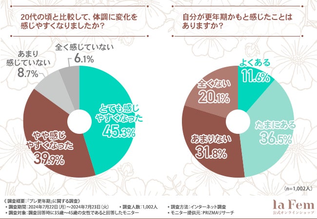 今回は35歳~45歳の女性に調査を行いました。プレ更年期とよばれる世代となり、更年期の症状に悩み始める時期といわれていますが、実際に20代の頃と比較して、ちょうどこの年齢のタイミングで体調に変化を感じやすくなった方が非常に多いことが明らかになりました。