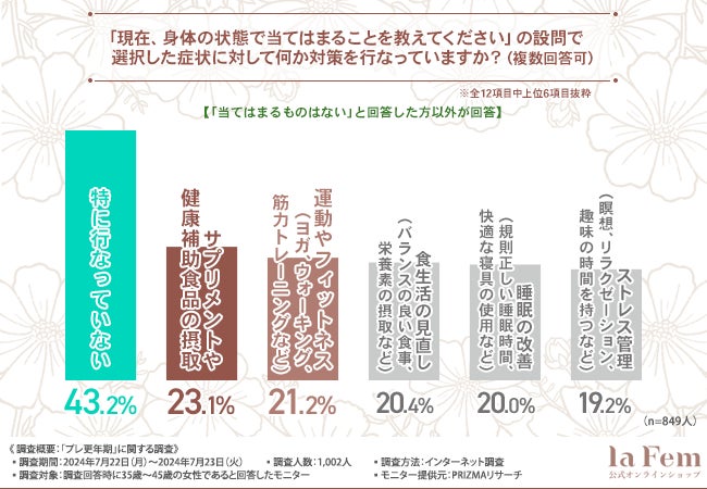前の質問で『当てはまるものはない』と回答した方以外に、「「現在、身体の状態で当てはまることを教えてください」の設問で選択した症状に対して何か対策を行なっていますか?(複数回答可)」と質問したところ、『特に行なっていない(43.2%)』と回答した方が最も多く、次いで『サプリメントや健康補助食品の摂取(23.1%)』『運動やフィットネス(ヨガ、ウォーキング、筋力トレーニングなど)(21.2%)』と続きました。