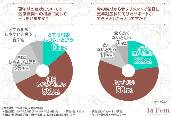 また、医療機関には更年期の症状を相談しづらいと思う方が多く、プレ更年期の段階からサプリメントなどで更年期症状に向けたサポートができることに前向きな印象をもつ方が非常に多い結果になりました。