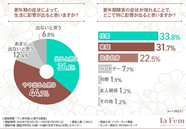 「更年期の症状によって、生活に影響が出ると思いますか?」と質問したところ、8割の方が『出ると思う(36.1%)』『やや出ると思う(44.7%)』と回答しました。