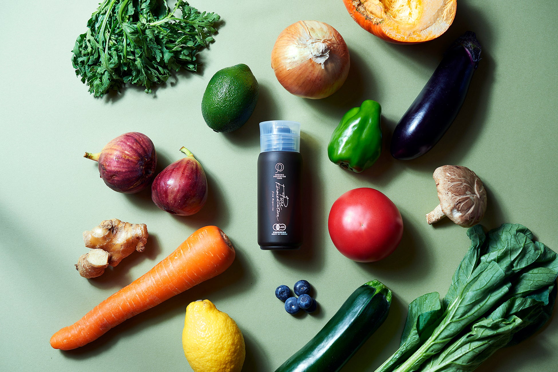 有機JAS認定の34種類の旬の野菜と果物のエキスを、滋賀県比叡山の麓の発酵工場でじっくりと発酵させエキスを抽出し、1年以上かけて作る発酵エキスです。