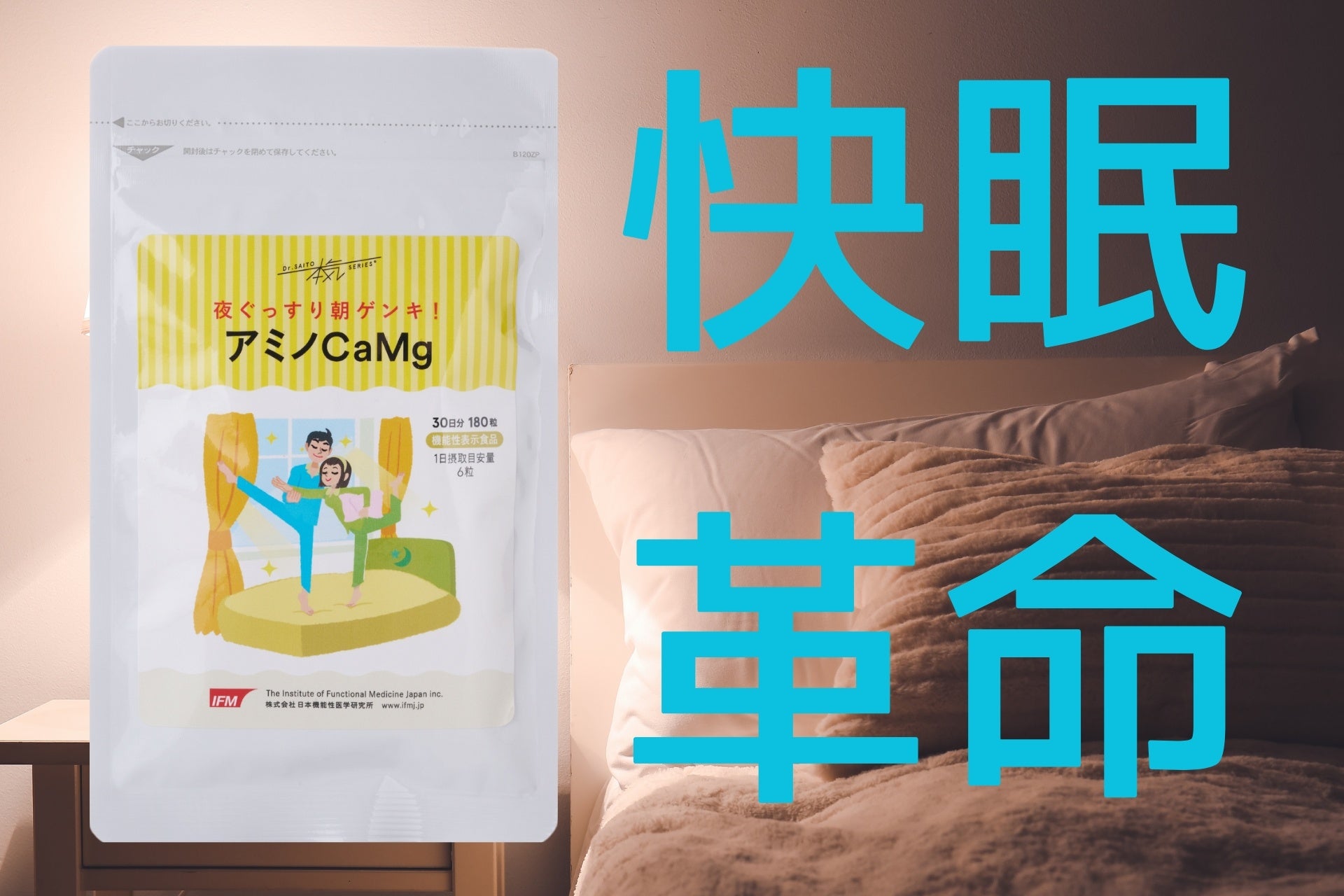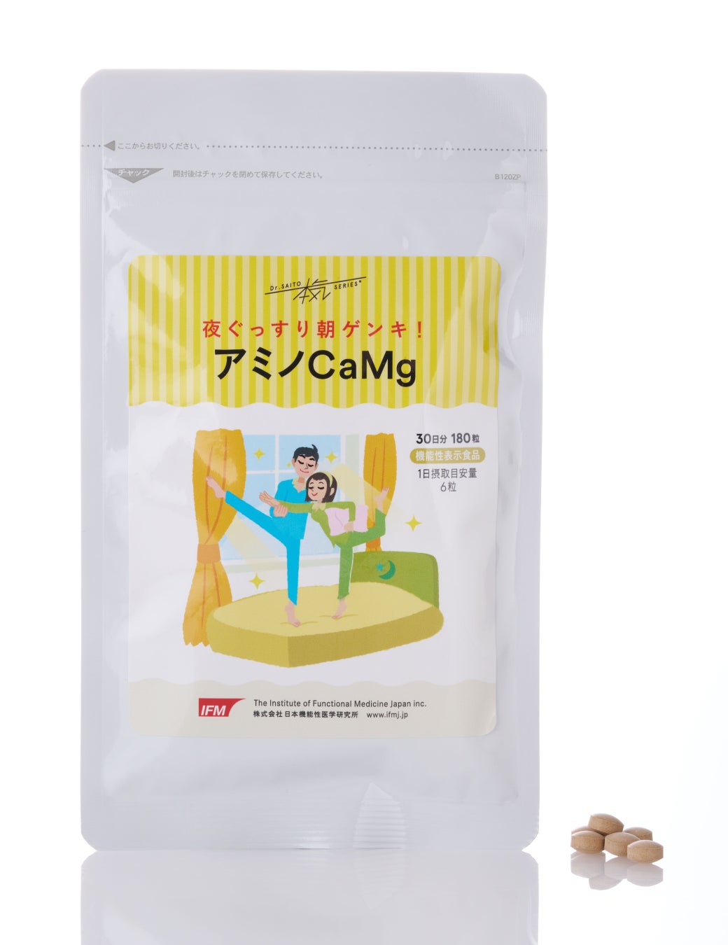 日本機能性医学研究所に元々あるサプリのひとつ「CaMg300」をベースに、機能性表示食品としてより睡眠サポート力を強化したのが新製品「夜ぐっすり朝ゲンキ!アミノCaMg(カルマグ)」です。