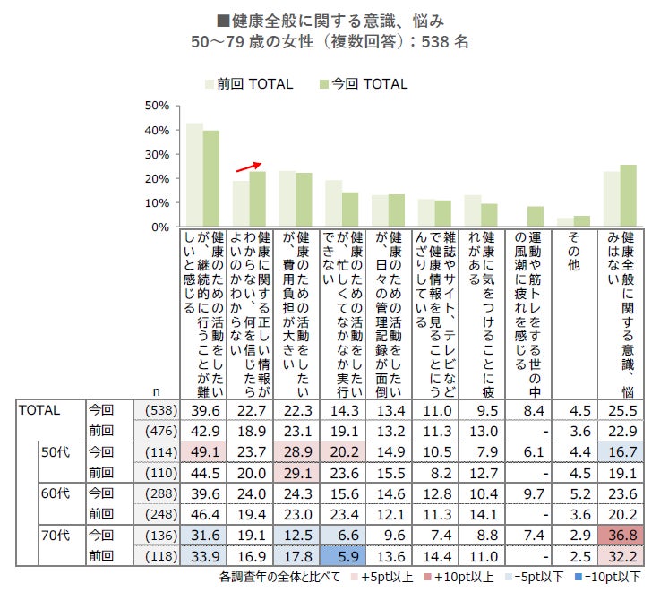 - 次いで「健康に関する正しい情報がわからない、何を信じたらよいのかわからない」が22.7%。前回調査から3.8ポイント増加。