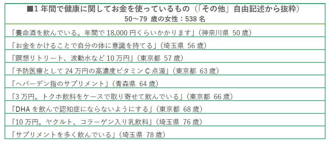 50代以上もジムに通う人が増え、フィットネスクラブ業界の市場規模が拡大したので「ジムなどの運動サービス」の消費額が増えることには合点がいきます。しかし、「サプリメント」「健康食品」の消費額の増加は意外でした。「サプリメント巡る健康被害」の問題で、機能性表示食品のサプリメントを買い控える動きが広がったという報道を目にしていたからです。利用者の割合も「サプリメント」52.0%、「健康食品」43.9%。「お金をかけることで自分の体に意識を持てる」、「予防医療として24万円の高濃度ビタミンC点滴」など、自分の未来の健康に惜しみなく消費する様子がうかがえる自由記述もありました。