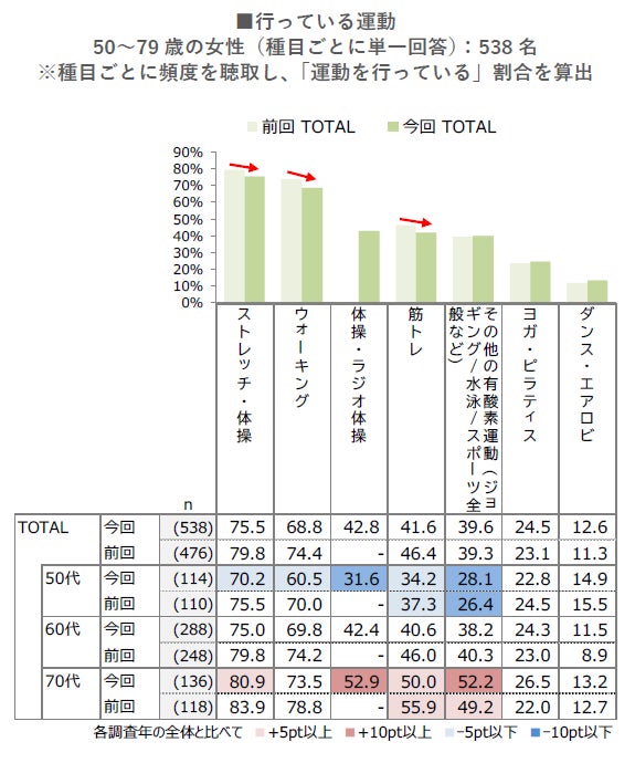 - 「ストレッチ・体操」「ウォーキング」「筋トレ」はいずれも前年から4~6ポイント程度減少。