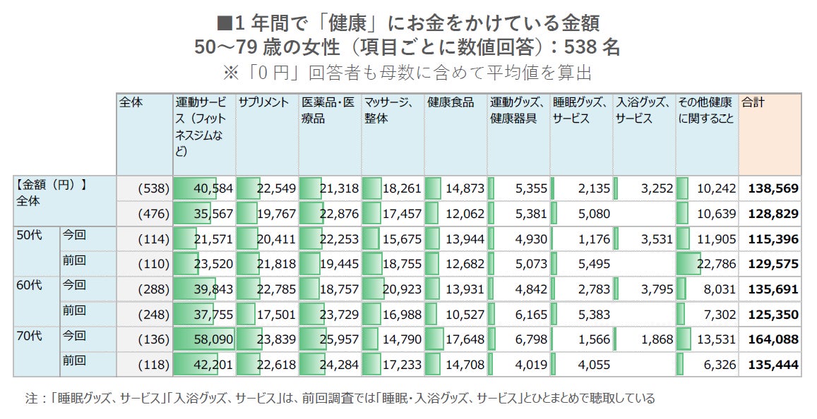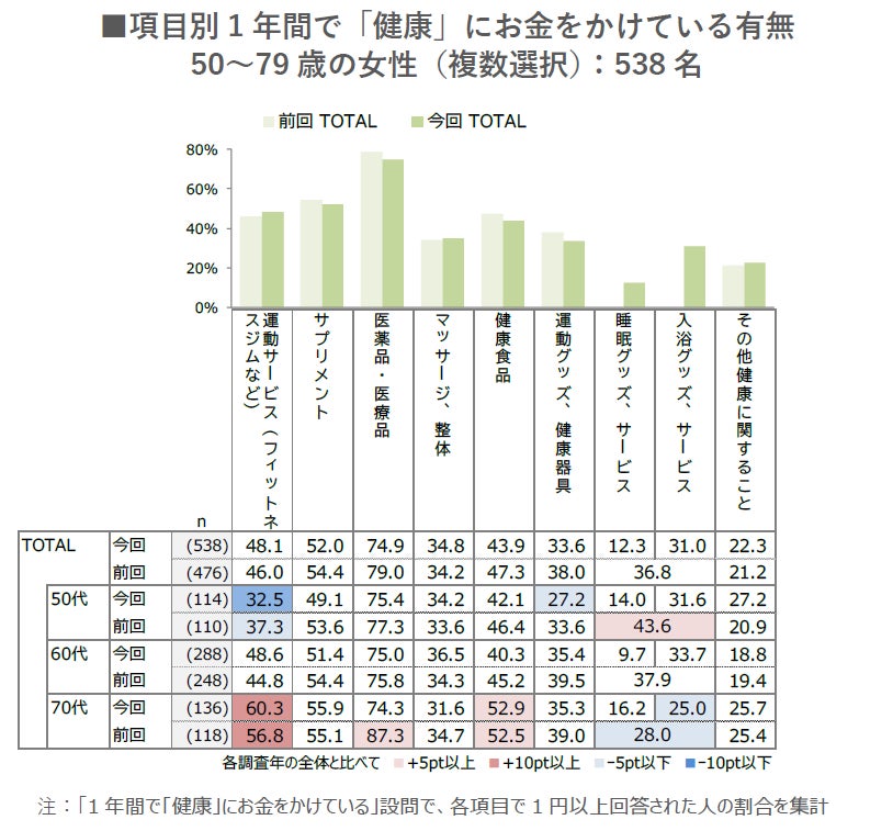 50~79歳女性は1年間に平均約14万円を健康に投じていました。2023年の調査から約1万円アップしており、60代が1万円、70代が3万円の増加です。増減の内訳をみると、「医薬品・医療品」は2千円弱減ったのに対し、「ジムなどの運動サービス」「サプリメント」「健康食品」が約3~5千円増えました。解決より予防にお金をかける傾向が強まったことを示しています。