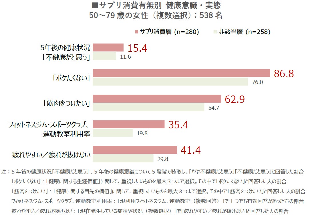「ストレッチ・体操」「ウォーキング」などの運動割合は減ったものの、「ジムなどの運動サービス」の消費額は上がりました。ジムで効率よく筋力をつける傾向になっていると解釈できます。また、サプリメント利用者は、「ボケたくない・筋肉をつけたいなど将来の健康不安が大きく、ジムに通う人の比率も高い」「疲れやすい/疲れが抜けない割合が高い」という特徴もありました。当該世代にとってサプリメントは、手っ取り早く健康が得られる必需品なのでしょう。