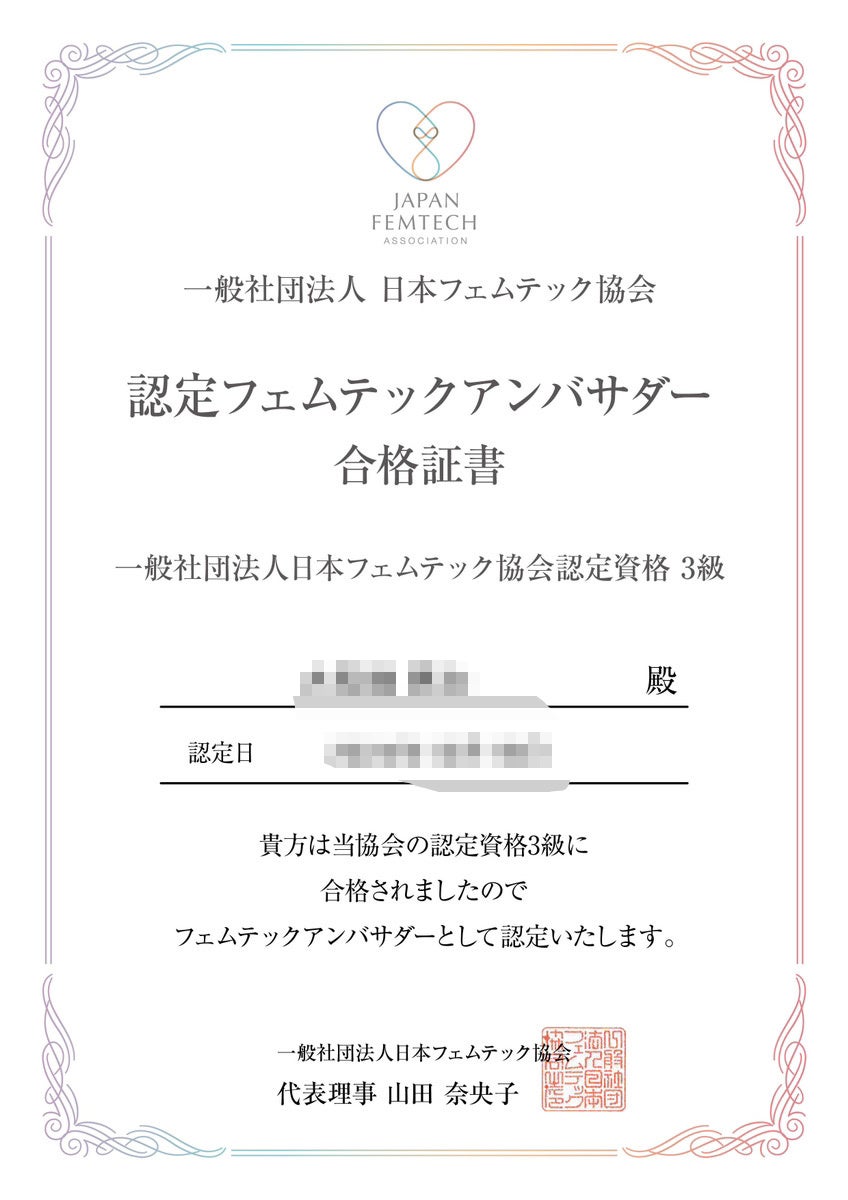 株式会社ウエルネスラボでは、社員全員が日本フェムテック協会認定資格3級を取得し、フェムテックアンバサダーとして認定されました。