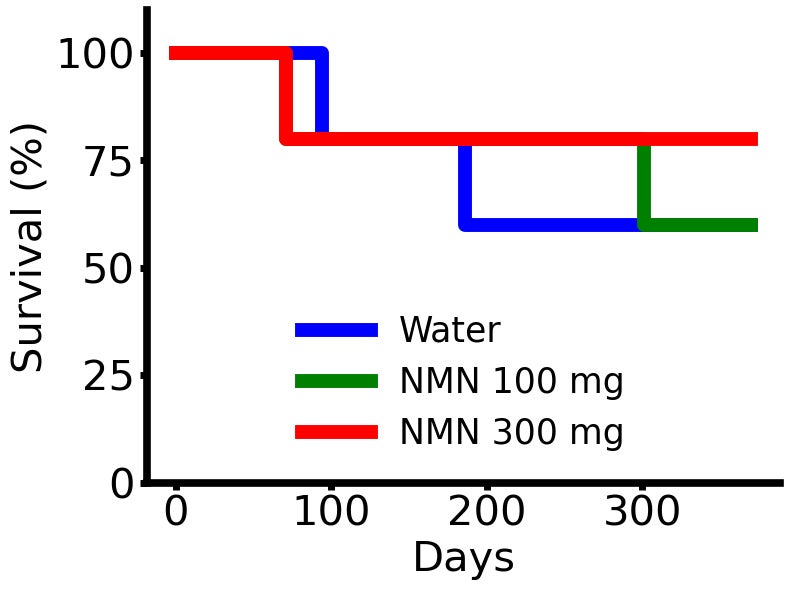 過去の研究では、高齢マウスにNMNを550 mg/kg投与した際、生存率に一定の変化が見られたと報告されています(ヒト等価容量換算換算:約3,130 mg/日、体重70 kg換算)。本研究では、NMNの摂取量に関する動物モデルでのデータを示しており、さらなる研究の必要性が示唆されました。