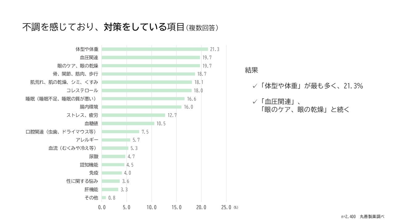 現在のカラダの不調について確認しました。全体では「体型や体重」が最も多く、次いで「血圧関連」「眼のケア、眼の乾燥」「骨、関節、筋肉、歩行」「肌荒れ、肌の乾燥、シミ、くすみ」という回答でした。