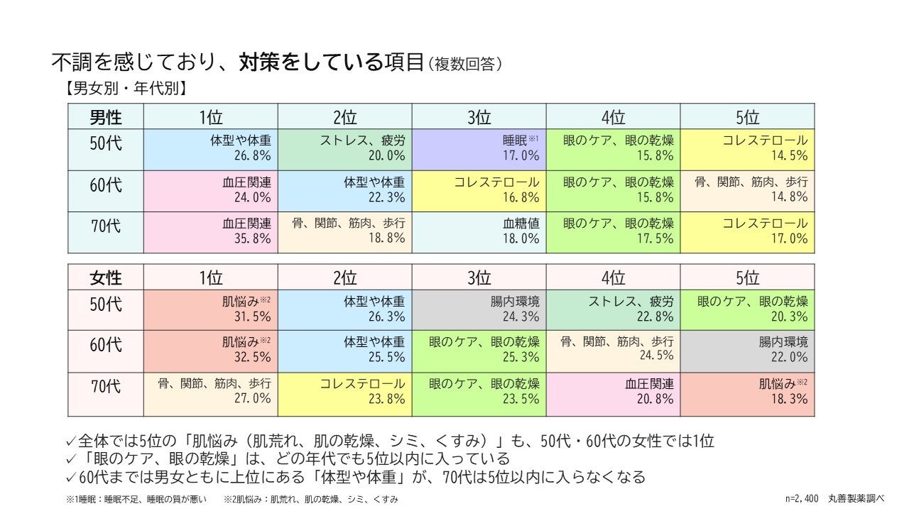 男女別・世代別では、男女ともに「眼のケア、眼の乾燥」がどの世代でも5位以内に入っていました。「体型や体重」については60代までは男女ともに上位にあるものの、70代では5位以内に入らず、他の項目が上位に入ることが確認されました。