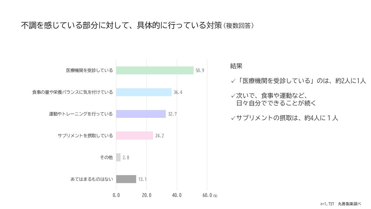 調査1で不調を感じている部分に対して、対策をしていると回答した方1,737人を対象に、具体的に行っている対策を確認しました。「医療機関を受診している」が約50%で最も多く、食事や運動など自分でできる対策を行う他、サプリメントの摂取は約4人に1人という結果でした。さらに、男女別・世代別に比較もしています。