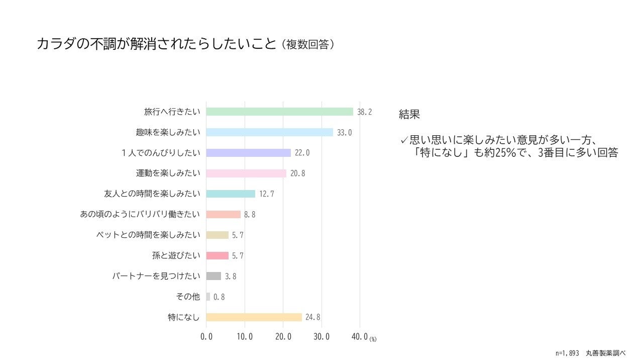 カラダの不調が解消されたらしたいことについて、思い思いに楽しみたい意見が多い一方で、「特になし」も約25%と、3番目に多い回答でした。何かを楽しみたいというよりも、ただ不調が解消されてほしいという方が一定数いるのではないかと推察されました。