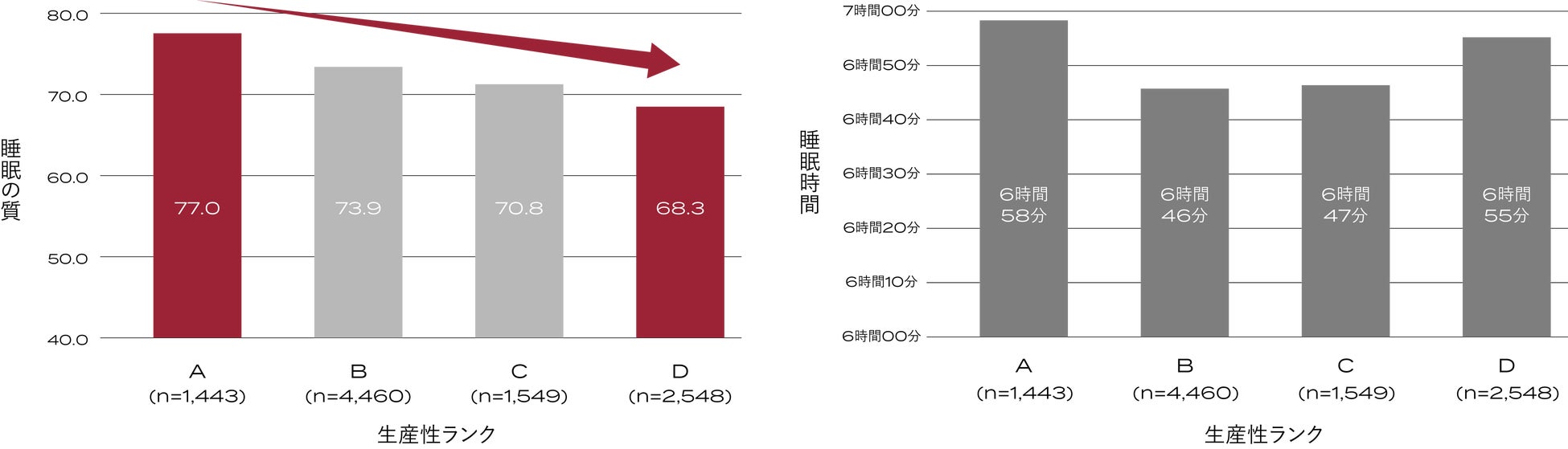 また近年、”睡眠の質”に注目が集まっており、特に日本はOECD加盟国の中でも平均睡眠時間が最も短く、日中の眠気やパフォーマンス低下が社会課題となっています。ブレインスリープが有職者1万人を対象とした「睡眠偏差値調査2024」では、約20%が「睡眠が生産性に強く影響を与えていると感じる」と回答し、「影響している」と回答した方と合計すると約70%に上ります。また同調査において「生産性と睡眠の質」、「生産性と睡眠時間」に関して、生産性レベルが高いほど「睡眠の質が高い」傾向が見られたが、「睡眠時間」では相関性は確認できませんでした。これは”睡眠の質”が生産性に影響を及ぼす可能性があることを示しています。