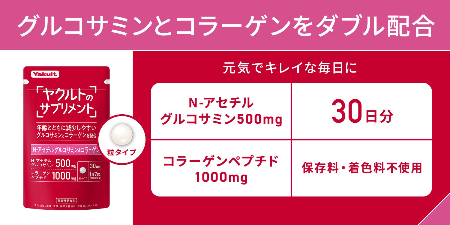 「ヤクルトのサプリメント」は“今から未来まで、ひとりでも多くの人の健康をサポートする”をコンセプトに、出来る限り長く、お客さまの健康に寄り添うことを目指した、サプリメントブランドです。今回発売する「N-アセチルグルコサミン&コラーゲン(210粒)」の他に、「鉄・葉酸(30粒)」、「カルシウム・マグネシウム・ビタミンD(120粒)」、「アミノ パーフェクト 粒タイプ(480粒)」などをAmazon.co.jpで販売中です。今後も性別や年代など個々のライフステージに合わせて選べる商品ラインアップを計画しています。