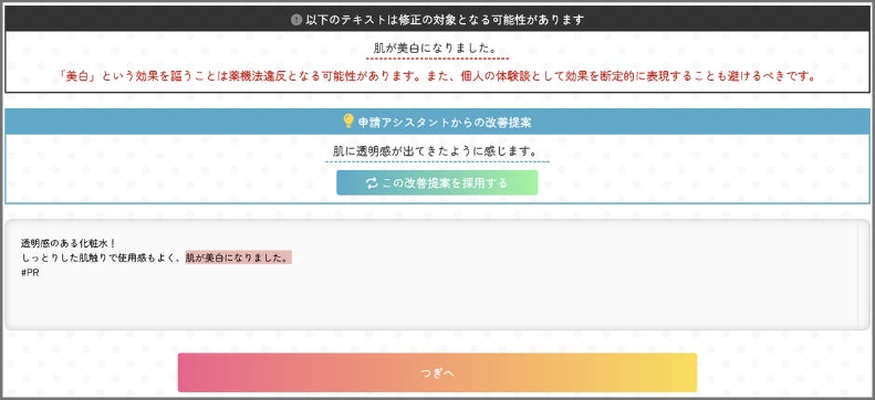 これまでも当社では薬機法や景品表示法を遵守するため、トラミー会員の投稿内容の審査を顧問弁護士監修の法令チェックツールと専門チームのダブルチェック体制で実施してまいりました。2023年10月より景品表示法によって施行されたステルスマーケティングの規制*²など、より一層高まる関連法規の遵守への要請に対応し、専門知識を要する校正業務の正確性の向上及び体制強化のため、2024年12月10日(火)より順次生成AIによる法令チェックツールの使用を開始します。